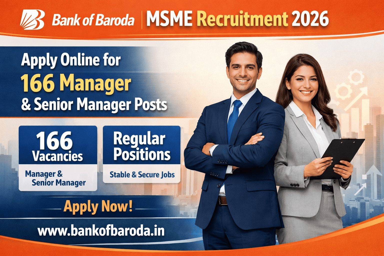 Bank of Baroda (BOB), one of India’s largest banks, has released an official recruitment notification (BOB/HRM/REC/ADVT/2026/07) for 166 vacancies in the MSME Banking Department. The bank is looking for experienced professionals for the roles of Senior Manager (Relationship & Credit Analyst) and Manager (Credit Analyst) on a regular basis.