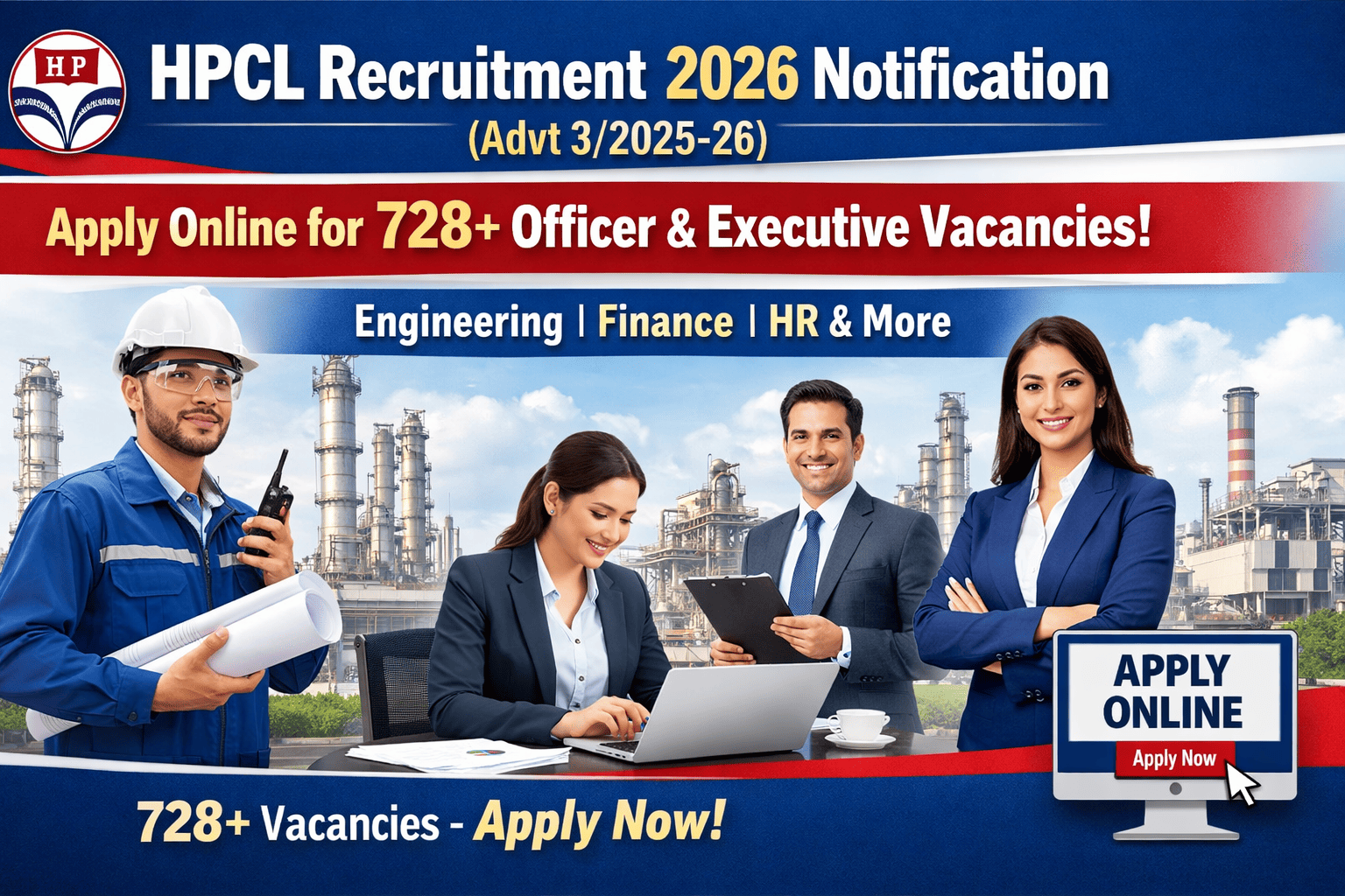 Hindustan Petroleum Corporation Limited (HPCL), a Maharatna Central Public Sector Enterprise, has announced a large-scale recruitment drive for various Officer profiles. This recruitment includes a wide range of positions for both fresh graduates (Junior Executives and Engineers) and experienced professionals in fields like Engineering, Finance, HR, and Information Systems.